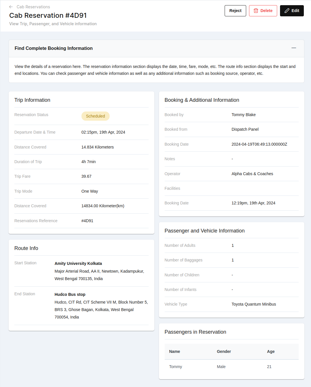 reservationcompanywasormadeservicebyproviderTommymanagingBlake.the trip. BookedFacilities:from:ListTheofbookingamenitiesoriginatedorfromservices provided during the'Dispatch Panel'.Booking Date: The reservation was logged at 10:06 am on April 19th, 2024.Notes: A space for additional booking-related notes (not utilized in this instance).Operator: Managed by 'Alpha Cabs & Coaches'.Facilities: Specific services or amenities included (if any).trip.