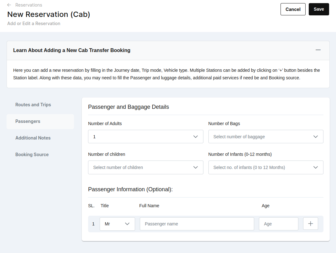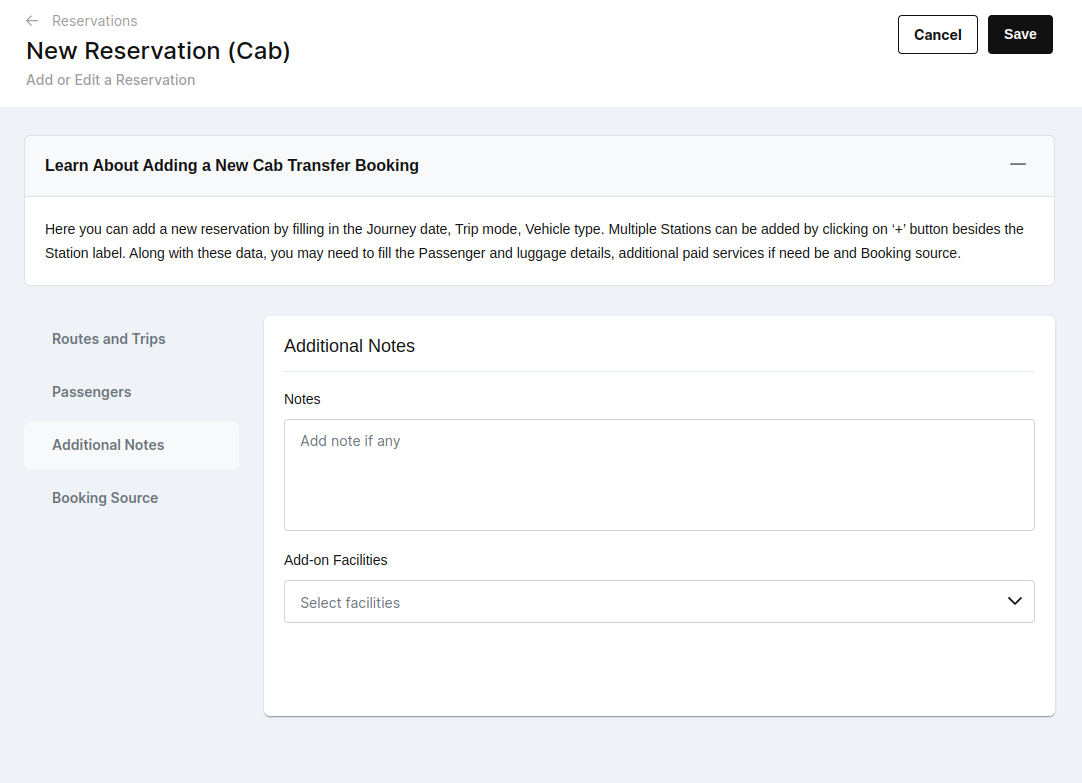 Learn About Adding a New Cab Transfer Booking: This introductory section provides customers with a brief explanation of the booking process and what information is required. It outlines that the form will capture details such as journey date, trip mode, vehicle type, and stations. It also mentions that additional passenger and luggage details, any extra paid services, and the booking source need to be filled in.