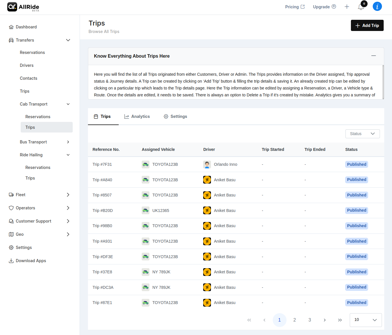 In the "Trips" section of the AllRide app, you’re presented with an organized view of all trip-related information. This area is essential for managing and reviewing the details of journeys booked through the system. Here’s a description of the displayed information and available actions: