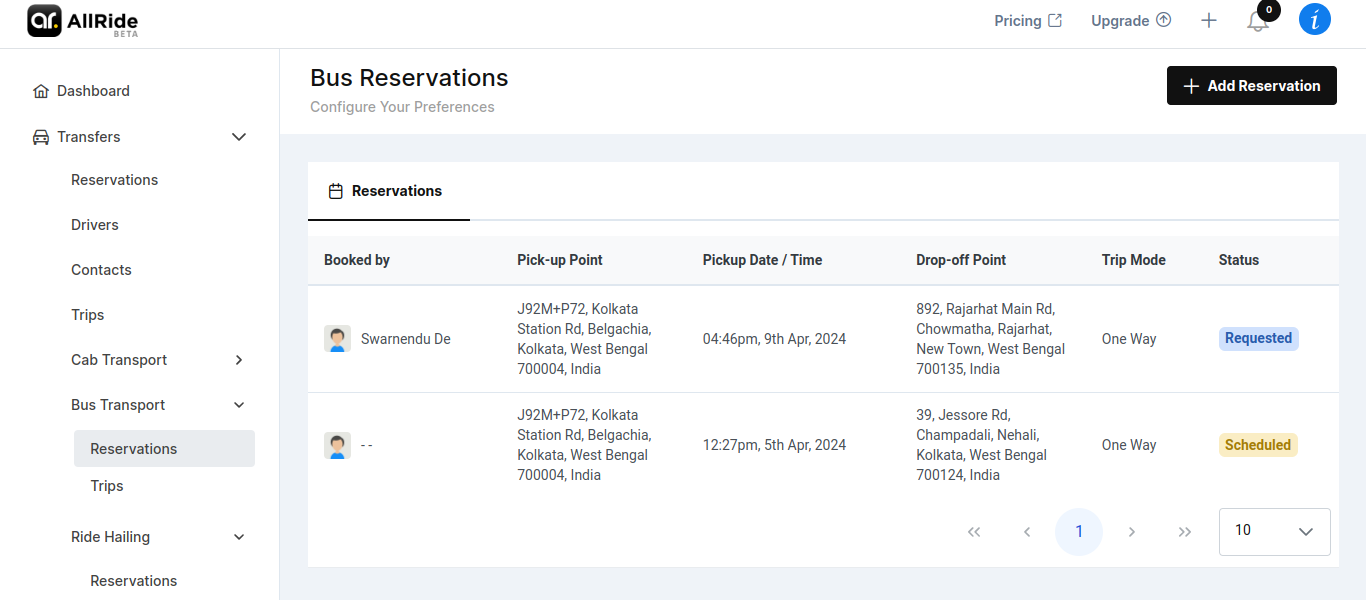 • This screen lists all bus reservations that have been booked through the AllRide platform.