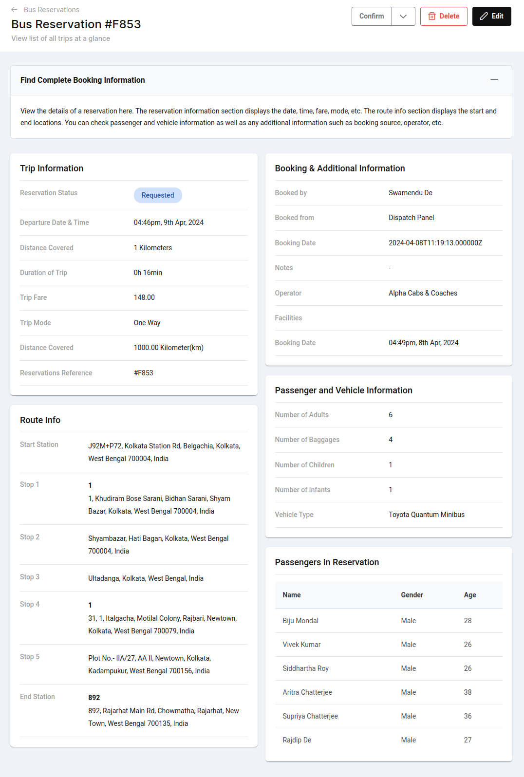 • It provides essential information such as who made the booking, the pick-up and drop-off points, the date and time of pick-up, the trip mode, and the current status of each reservation.