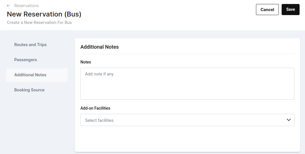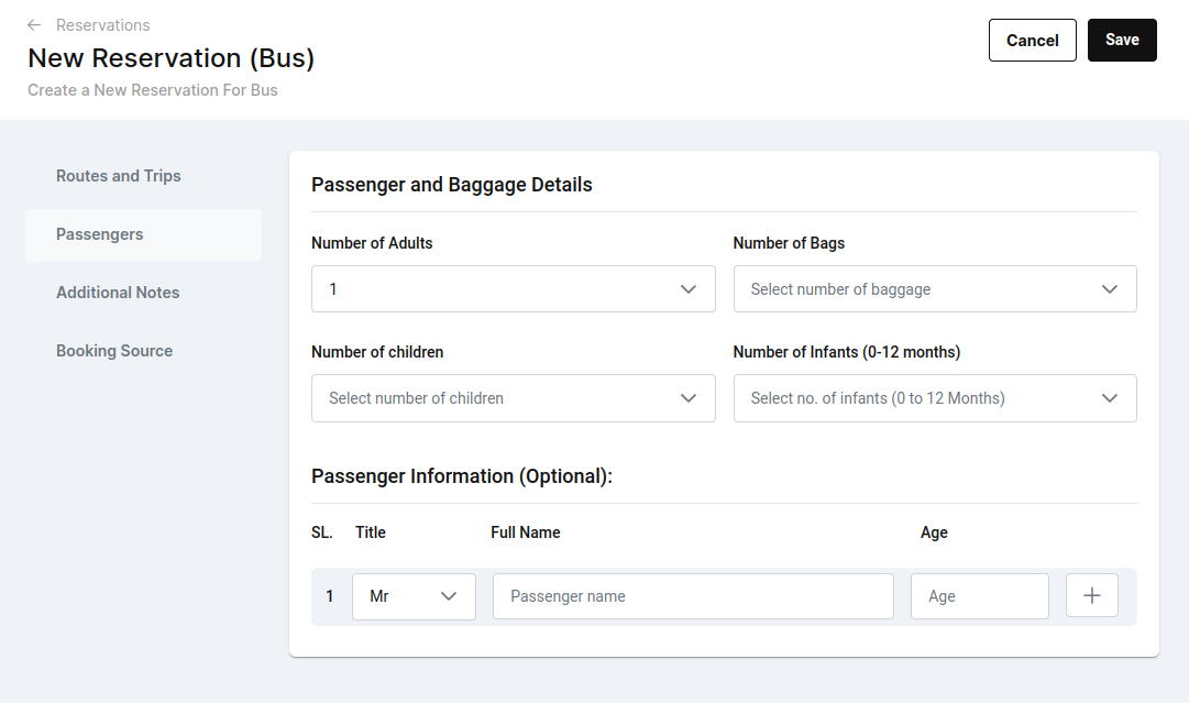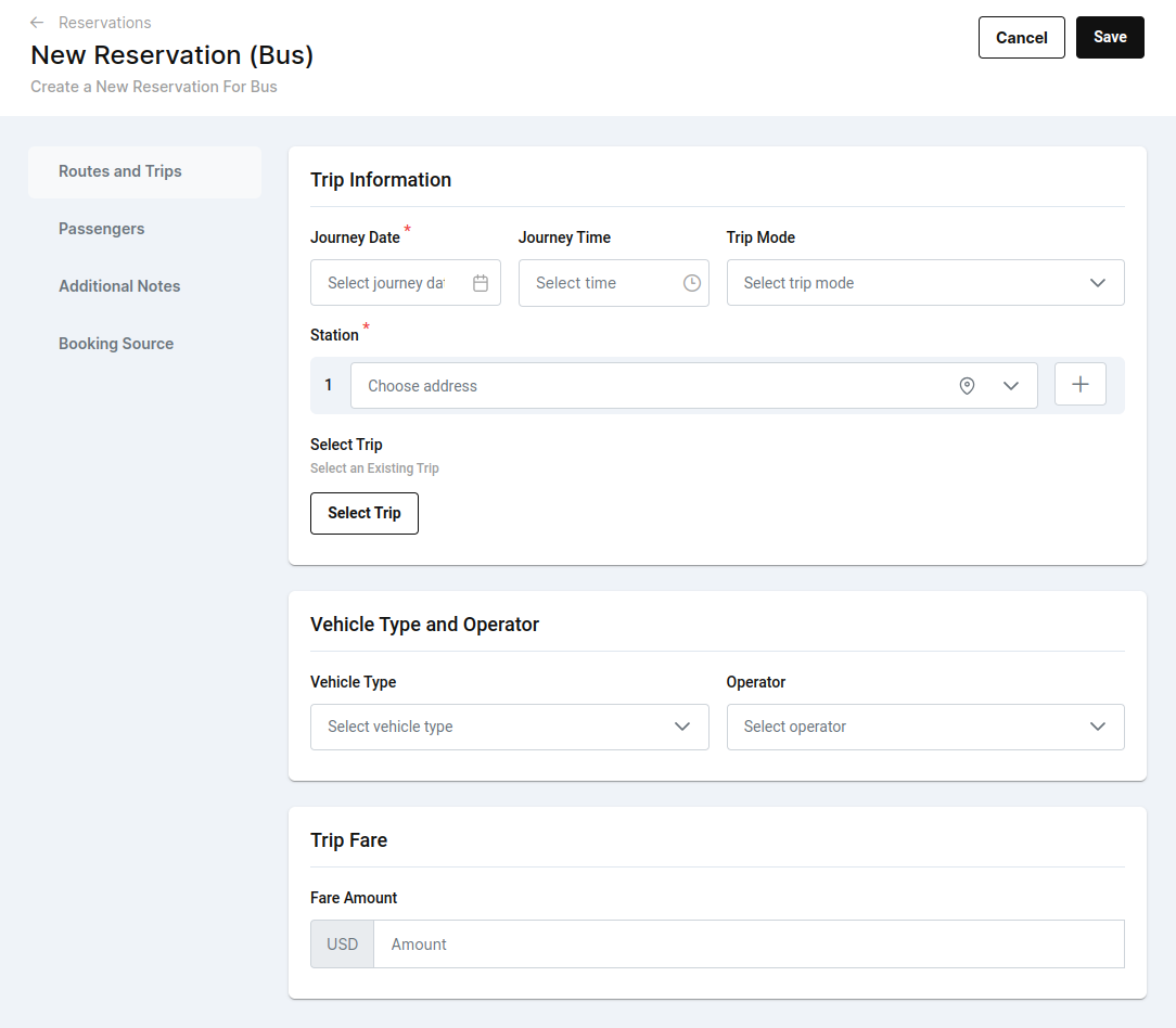 Each tab contains specific fields that are crucial for creating a complete and accurate bus reservation. It's important to fill in all the required information in each tab to ensure that the reservation reflects the passengers' needs and travel details accurately. After completing all sections, you'll use the 'Save' button to finalize the booking or 'Cancel' to discard it.